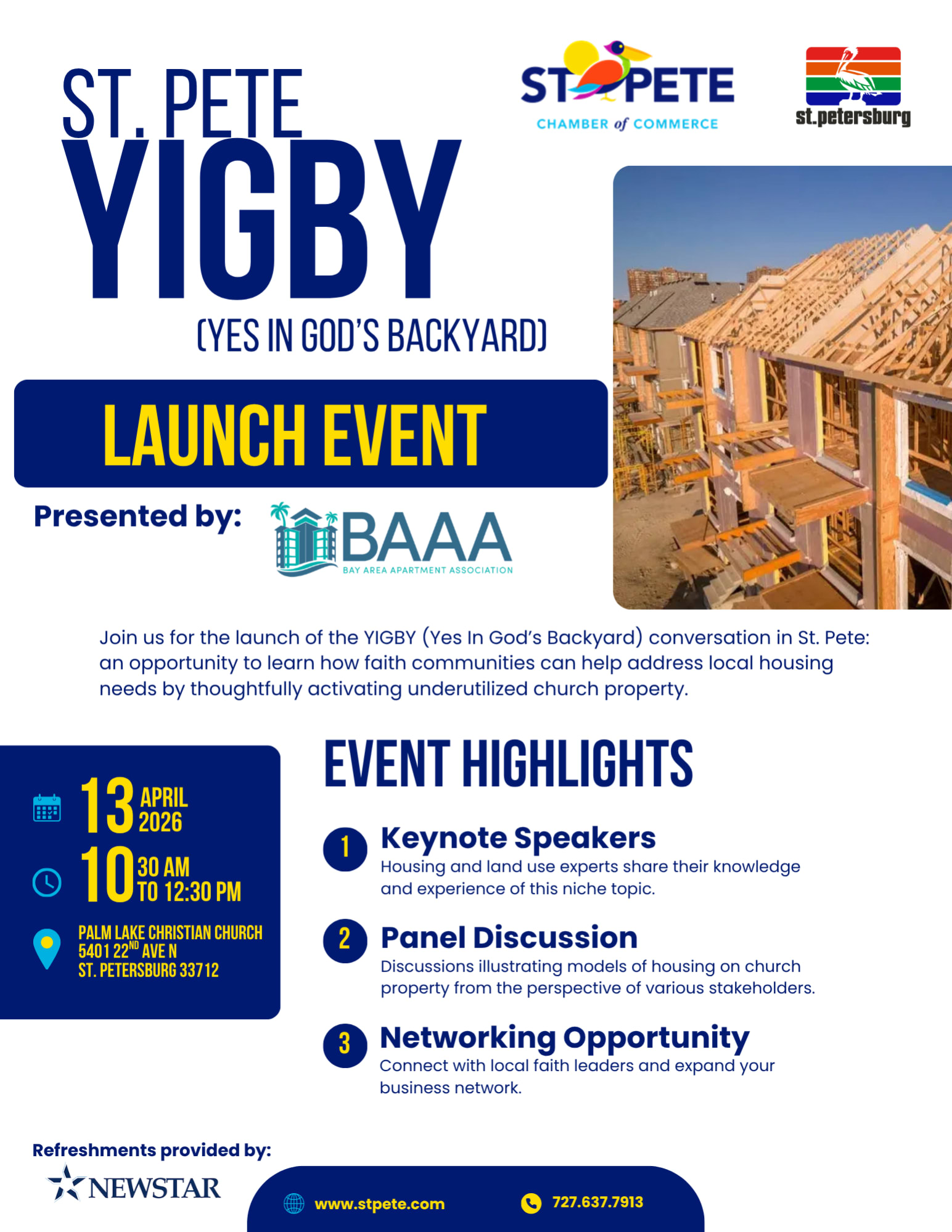Faith leaders and interested community members are invited to join the St. Petersburg Area Chamber of Commerce, the City of St. Petersburg, and the Bay Area Apartment Association for the launch of the YIGBY (Yes In God’s Backyard) initiative—an opportunity to learn how faith communities can help address local housing needs by thoughtfully activating underutilized church property.