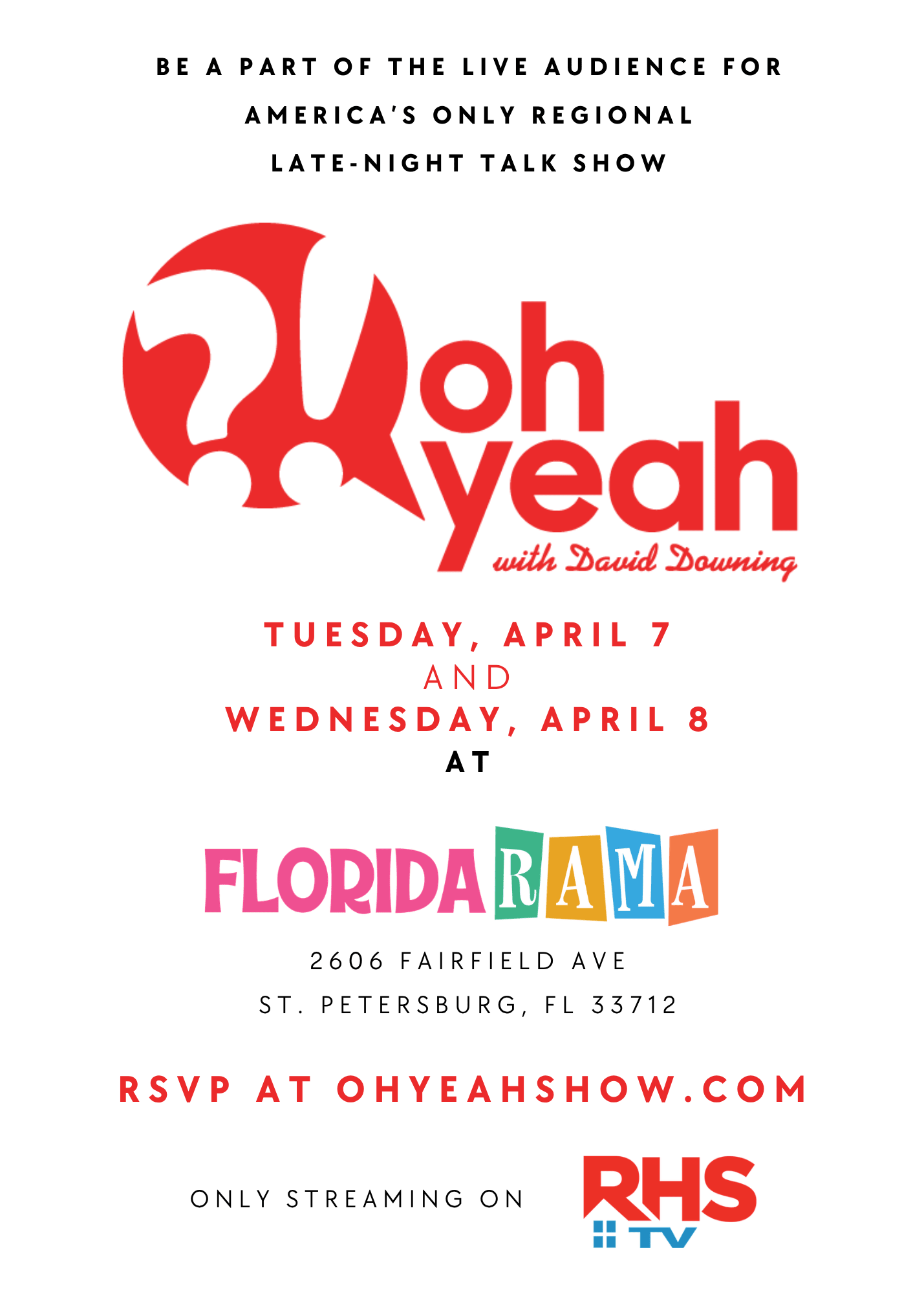 The Oh Yeah?! Show with David Downing is a late-night talk show with a Tampa Bay edge. Filmed in St. Pete’s burgeoning Warehouse Arts District, the show brings the classic late show format to life, complete with a seven-camera studio set and a live eight-piece funk band, The Oh Yeah?! Yeahs. Season 1 featured 14 episodes airing Monday nights on RHStv. Season Two will begin airing later this summer across RHStv and digital platforms, including Apple TV, Roku, Amazon Fire, iOS, and Google Play. For more information or to reserve a seat in the studio audience, visit ohyeahshow.com